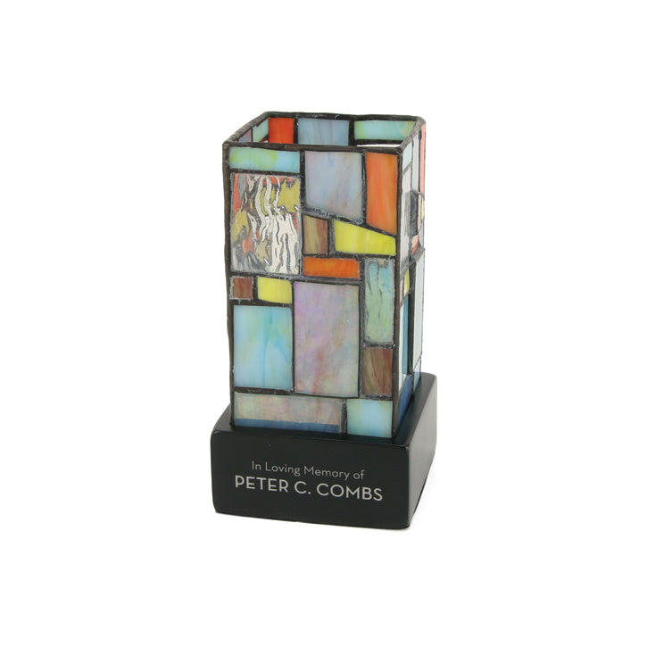 Created from hand-cut pieces of stained glass, the Paragon Geometric Memory Chest and the Paragon Keepsake Light represent artistry and excellence. The designs feature eye-catching shades of green, turquoise, purple and amber along with some sections raised to add a touch of whimsy.